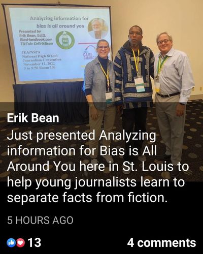 is the author of Bias Is All Around You: A Handbook for Inspecting Social Media & News Stories, a 2022 American Writing Awards gold medal recipient in academic/education, a 2022 Nautilus Book Award and Readers’ Favorite, silver medallion recipient in young-adult nonfiction and writing/publishing respectively. The book teaches people from all walks of life how to separate facts from fiction in any piece of information. Erik also is a 2022 Henry Ford Innovation Nation First Place winner for his media literacy studies tied to the book. In June of 2023 Erik's peer reviewed article, Seven Initial Prominent Sources of All Information Bias Impartiality Types Parsed was published in the European journal, Media Literacy and Academic Research. Read his latest study which also comments on the overall partiality of artificial intelligence (AI) within academic, for-profit, government, hidden agenda, individuals, nonprofit, and watchdog groups.